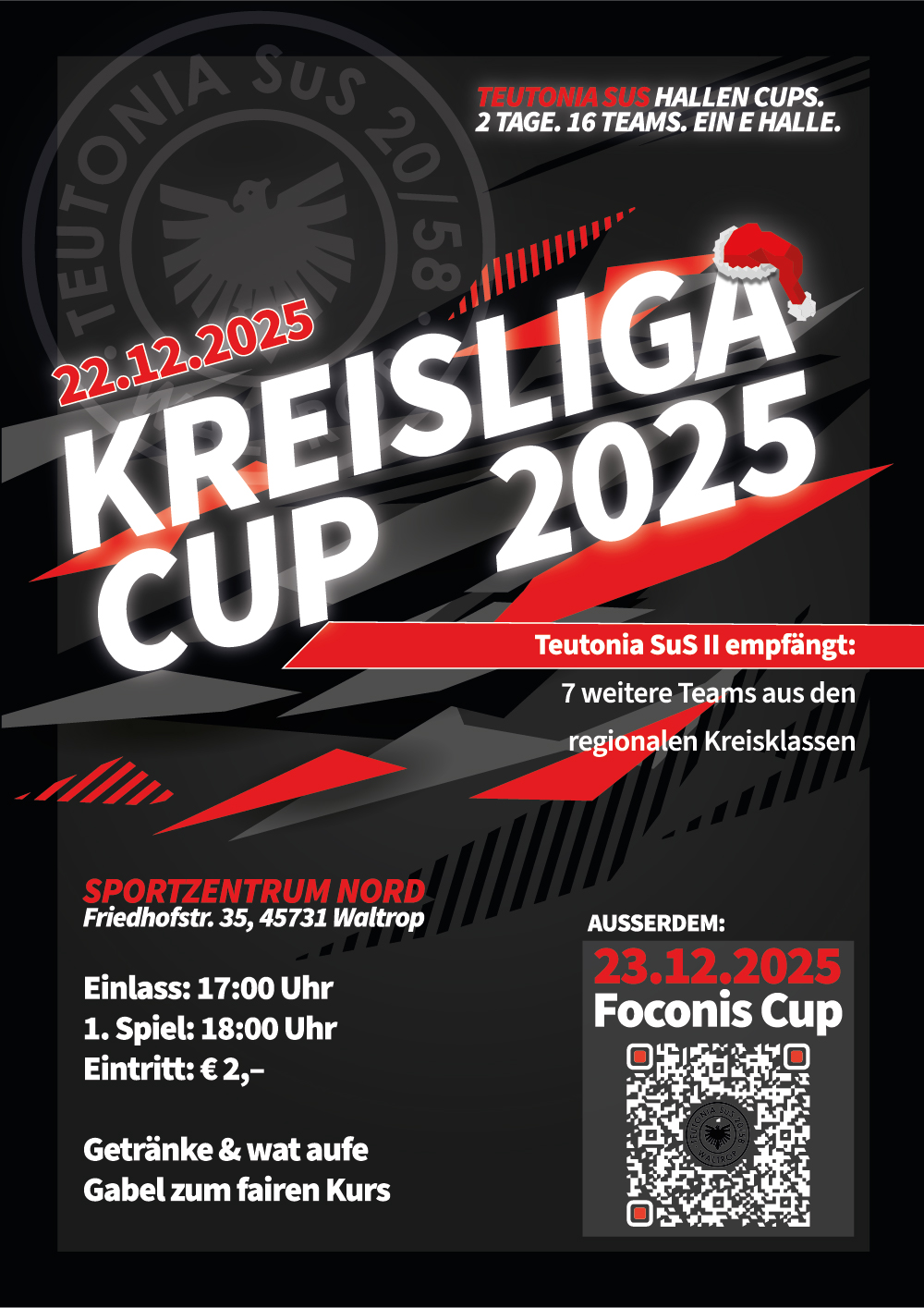 Nicht nur geht es wieder los, sondern Teutonia SuS ist mit einer zweiten Mannschaft zurück und heißer denn je auf den Gewinn des eigenen Pokals beim Teutonia SuS Kreisliga Cup 2025! Wie immer spielen 8 Kreisliga-Teams in der Sporthalle des Sportzentrums Nord um den Titel.